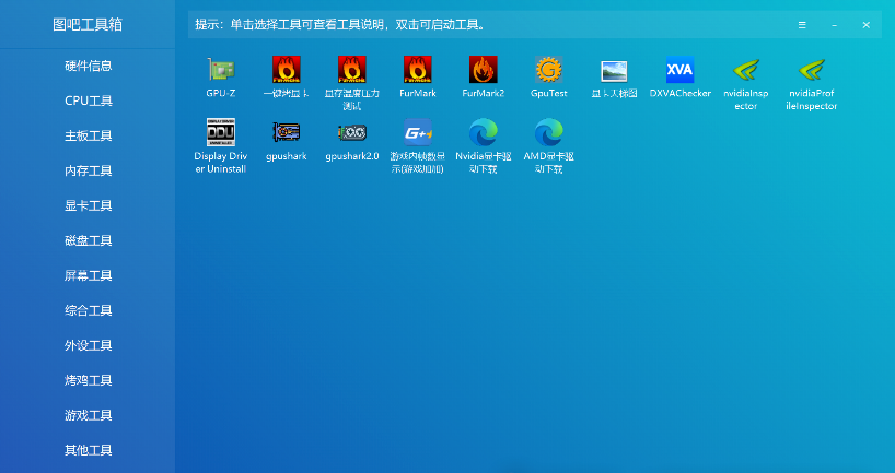 图吧工具箱(全名图拉丁吧硬件检测工具箱)是个免费开源绿色纯净的硬件检测工具合集,专为所有计算机硬件极客,DIY爱好者,各路大神及小白制作,这款免费硬件工具箱集成大量常见硬件检测和测试工具及评分工具.