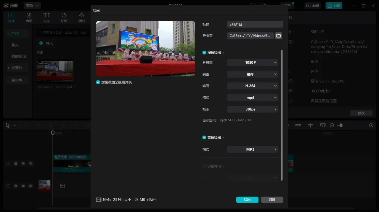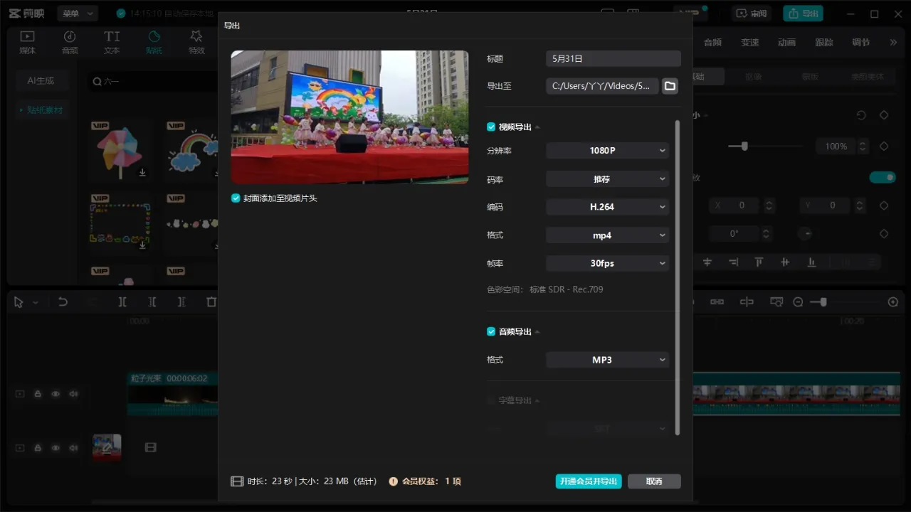 然后导入一段视频,这里以六一儿童节跳舞视频为例,当我在剪映里使用一段VIP素材时,再导出是要收费的。